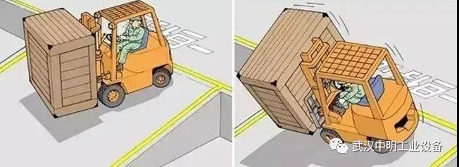 5、叉車在裝貨后,倒向離開時,由于過早轉向,導致貨叉未離開貨物,發(fā)生側翻。